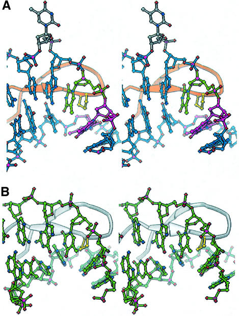 Fig. 5. Stereo views of (A) the HU and (B) the IHF α-subunit arms at the site of DNA kinking. The DNA step parameters are remarkably similar for analogous base pairs despite the differences in sequence and the extra two unpaired Ts in the HU structure. Colors are the same as in Figure 3.