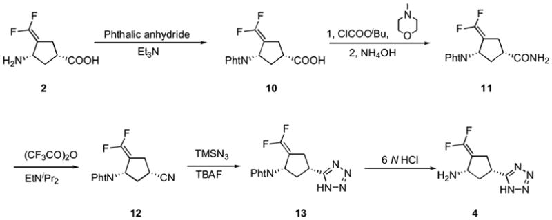 Compound 4 was synthesized from 2 as shown in Scheme 2. The amino group in 2 was protected with phthalic anhydride to give 10. The carboxylic acid group in 10 was converted to amide 11, which underwent dehydration to give nitrile 12. The method of Amantini and coworkers32 was used to obtain tetrazole 13. Treatment of 13 with 6 N hydrochloric acid deprotected the phthalic group and provided 4.