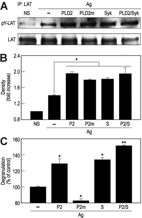 Overexpression of HA-PLD2 or Syk enhances phosphorylation of LAT activation as well as degranulation. (A-B) RBL-2H3 cells were transfected with cDNA constructs for HA-PLD2 (PLD2 or P2), catalytically inactive PLD2K758R (PLD2m or P2m), Syk (S), or vector (–). Cells were stimulated for 7 minutes with antigen (Ag) or not stimulated (NS). LAT was immunoprecipitated from cell lysates with anti-LAT antibody, and precipitated proteins were subjected to immunoblot analysis for detection of LAT and phosphorylated LAT (pY-LAT) with anti-LAT and antiphosphotyrosine antibodies. Representative blots (A) and densitometric data (B) from 3 experiments are shown. (C) Cells were also stimulated with antigen for 7 minutes for measurement of release of the granule marker, β-hexosaminidase. Values are expressed as percent of release of β-hexosaminidase in vector-transfected cells (about 31% release) and are the mean ± SEM of values from 3 experiments. Significant increase or decrease in release: *P < .05; **P < .01.