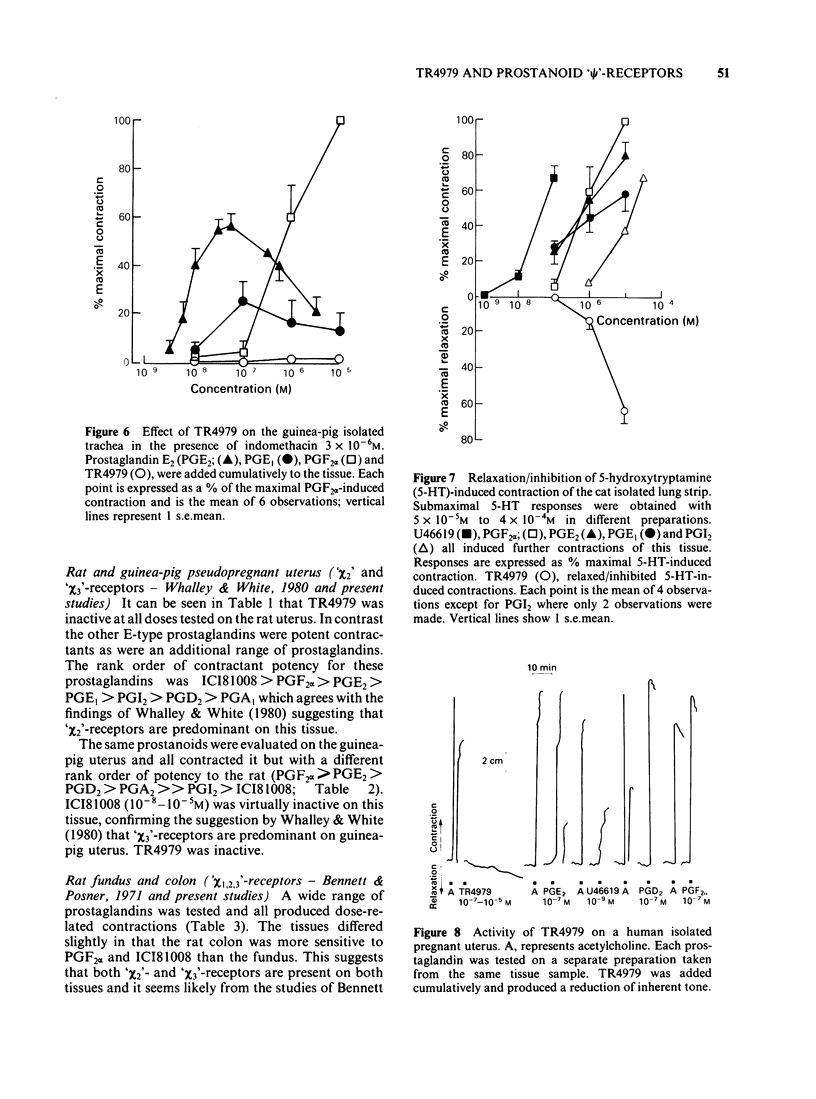 TR4979, an analogue of prostaglandin E1 (PGE1) was evaluated on respiratory and non-respiratory isolated tissues known to contain heterogeneous or homogeneous populations of the two classes of prostanoid (prostaglandins and thromboxanes) receptors. These receptors are classified as 'chi' the contractant/stimulant receptor with 'chi 1,2,3' being three subdivisions and 'psi' the relaxant/inhibitory receptor(s). On a respiratory tissue (cat trachea) containing predominantly 'psi'-receptors, TR4979 was 26 times less potent than PGE1 or PGE2. On other respiratory tissues known to contain mixtures of the 'chi 1,2,3'- and 'psi'-receptors (guinea-pig trachea and lung strip, cat lung strip and human bronchial muscle), TR4979 consistently acted as a potent relaxant whereas PGE2 and to a lesser extent PGE1 had significant contractant activities. Human pregnant uterus, guinea-pig and rat pseudo-pregnant uteri, rat colon and fundic strips and chick ileum are known to contain one or more of the three subclasses of the 'chi'-receptor. TR4979 (10(-9) -10(-5) M) was inactive on all these tissues whereas all of the reference prostanoids were contractants of varying potencies. PGE1 and histamine-induced contractions of the guinea-pig isolated ileum were both non-competitively antagonized by increasing concentrations of TR4979 suggesting that 'psi'-receptors also exist on this tissue. TR4979 is a highly selective agonist of prostanoid 'psi' (relaxant/inhibitory)-receptors which at present have been demonstrated to exist mainly in the lung. This prostaglandin analogue is a useful new selective pharmacological tool for revealing as yet unidentified prostanoid 'psi'-receptors and actions in a wide range of non-respiratory tissues/organs such as the guinea-pig ileum.