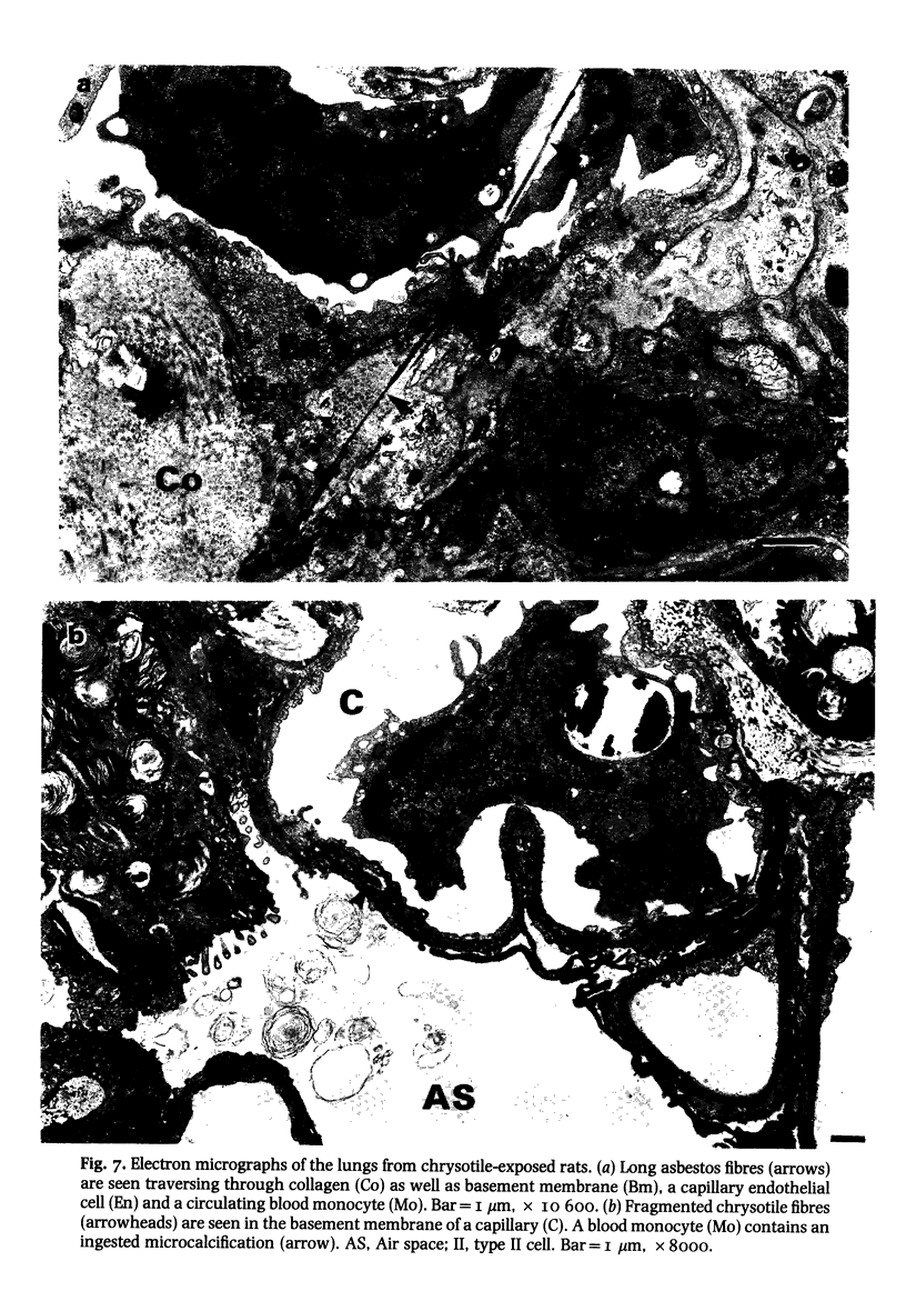 Although all commercial types of asbestos can cause pulmonary fibrosis, little is known about ultrastructural differences in the evolution of pulmonary lesions induced by amphiboles and serpentines. The present study was designed to compare the histological and ultrastructural effects produced by chronic inhalation of either crocidolite (amphibole) or chrysotile (serpentine) asbestos in the rat. Animals, exposed by intermittent inhalation for 3 months, were killed after 2 to 16 months. When inhaled, both types of asbestos caused thickened alveolar duct bifurcations associated with macrophage aggregates. Crocidolite inhalation also produced subpleural collections of alveolar macrophages and lymphocytes. Electron microscopy revealed some similarities, but also distinct differences, in the pulmonary distribution of inhaled chrysotile and crocidolite. Whereas both asbestos varieties were identified within the pulmonary interstitium, only crocidolite was detected inside alveolar macrophages. Chrysotile fibres were seen infrequently within the vascular compartment. Microcalcifications were noted after chrysotile inhalation, but were never observed following crocidolite exposure. Both asbestos types induced slight pulmonary fibrosis. These findings indicate that crocidolite and chrysotile produce different pathogenetic features, although both are fibrogenic.