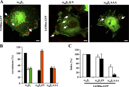 Despite being unable to detectably recruit Rho, β2Δ755 and β2AAA were still able to up-regulate Rho activity upon RBC binding (Fig. 4 C and not depicted). This suggests that Rho activation and visible accumulation at sites of particle binding are independent steps and that Rho activation precedes its stable recruitment. In line with this, inactive (N19) Rho is not recruited beneath RBC bound to αMβ2 (Fig. 7). To obtain further evidence of the mechanism involved, we analyzed the recruitment of a constitutively active form of Rho (L63) in cells cotransfected with αM and β2 with either wt, AAA, or ΔN (lacking the Rho activation domain but comprising the three threonine residues). Although β2ΔN cannot activate Rho (Fig. 4 C), coexpression with L63Rho allowed the recruitment of GFP-tagged, active Rho underneath RBC. However, when the experiment was repeated with β2AAA, L63Rho was no longer recruited to nascent phagosomes (Fig. 7, A and B), confirming our hypothesis that Rho is locally recruited to forming phagosomes in its active, GTP-bound form, in a manner that is dependent on threonines 758–760.