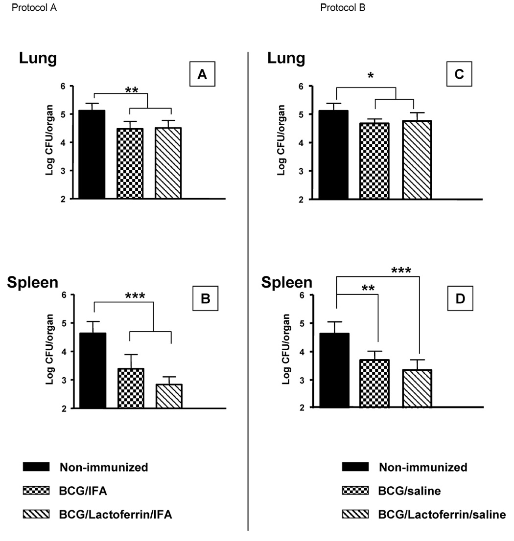 4.1. BCG vaccination with lactoferrin increases protection against challenge with virulent M. tuberculosis, in both emulsion (Protocol A) and saline (Protocol B) vaccine formulations