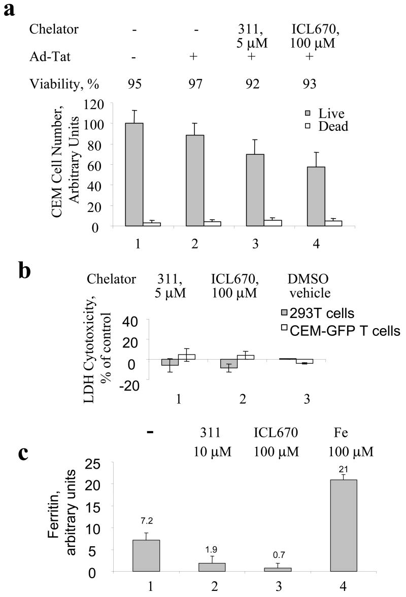 (a) CEM-GFP cells were grown in 96-well plate, infected with Ad-Tat and treated with the indicated concentration of 311 and ICl670. Cell cultures were continued for 24 hours, and the cells were counted to determine cell viability by Trypan blue exclusion assay. (b) Cytotoxicity of iron chelators was measured by lactate dehydrogenase (LDH) release. CEM-GFP cells or 293T cells were grown in 96-well plate and treated as indicated with 311, ICL670 or DMSO vehicle for 24 h. Cytotoxicity was measured as described in methods. Percentage of cytotoxicity was calculated using the formula [(Absorbance of the treated samples – Absorbance of control untreated cells)/(Absorbance of high control – Absorbance of control)] *100. (c) The effect of iron chelators on cellular ferritin. CEM-GFP cells were grown in 96-well plate and treated as indicated with 311, ICL670 or ferric ammonium citrate for 24 h. Ferritin concentration was measured by ELISA as described in the Methods.