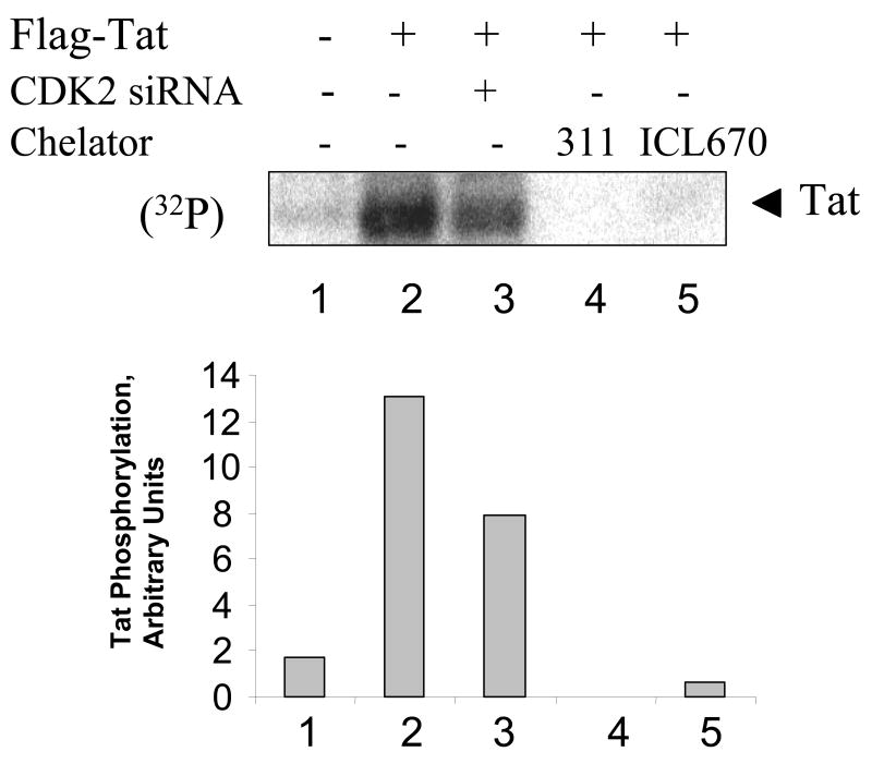 We recently showed that CDK2 phosphorylates HIV-1 Tat in cultured cells (Ammosova et al., 2006). Phosphorylation of Tat was increased in HeLa cells infected with Ad-Tat and treated with okadaic acid to inhibit PPP-phosphatases (Ammosova et al., 2006). To analyze if iron chelators affect Tat phosphorylation, HeLa cells were infected with Adeno-Tat and incubated 48 hours post infection to allow expression of Tat, with or without the treatment with iron chelators. As a control, we also transfected cells with CDK2-directed siRNA that we previously showed to block Tat phosphorylation (Ammosova et al., 2006). The cells were pulsed with (32P)-labeled orthophosphate and treated with okadaic acid, Tat was immunoprecipitated from cellular lysates, resolved by SDS-PAGE on 15% Tris-Tricine gel (Schagger et al., 1996) and detected by Phosphor Imager (Fig. 6, lane 2). Inhibition of CDK2 by siRNA reduced the level of Tat phosphorylation (Fig. 6, lane 3). Treatment with 311 or ICL670 also significantly reduced Tat phosphorylation. Taken together, iron chelators inhibit CDK2 activity in cultured cells and also affect Tat phosphorylation.