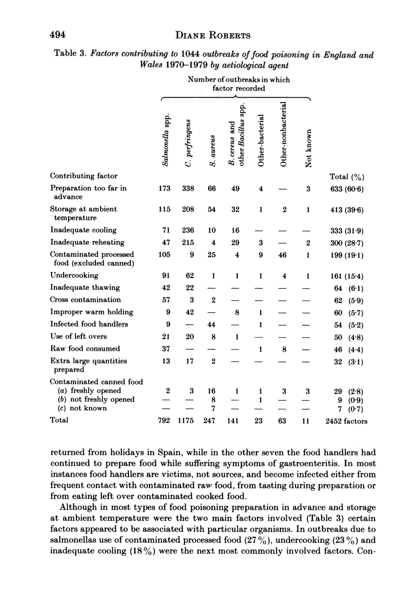 Epidemiological data accompanying reports of more than 1000 outbreaks of food poisoning have been studied to determine the factors which most frequently contributed to the outbreaks. Preparation of food in advance of needs combined with improper storage and inadequate cooking, cooling and reheating were the most common factors. Infected food handlers did not play a significant role except in instances of S. aureus food poisoning.