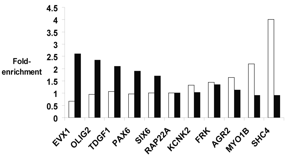 (A) The Maxfour values (see METHODS) are plotted for the ZNF217 ChIP-chip data for MCF7 and Ntera2 promoter1 arrays. The boxes indicate regions used for determination of “Ntera2-exclusive” promoters [values less than 0.3 (log2) in MCF7 and greater than 1.5 (log2) in Ntera2] and “MCF7-exclusive” promoters [values less than 0.4 (log2) in Ntera2 and greater than 1.0 (log2) in MCF7]. For the promoter 2 arrays, the values used to identify “Ntera2-exclusive” promoters were less than 0.3 (log2) in MCF7 and greater than 0.8 (log2) in Ntera2 and the values for “MCF7-exclusive” promoters were less than 0.4 (log2) in Ntera2 and greater than 0.8 (log2) in MCF7; see Supplemental Figure S1 for the promoter 2 comparison graph. (B) Five targets identified to be Ntera2-specific (EVX1, OLIG2, TDGF1, PAX6, and SIX6) and five targets identified to be MCF7-specific (KCNK2, FRK, AGR2, MYO1B, and SHC4) from the ChIP-chip array data were analyzed by PCR using a new set of Ntera2 (black bars) and MCF7 (white bars) ChIP samples. The fold enrichment of each promoter was determined by comparing the signal obtained using 10 ng of the ZNF217 amplicon to the signal obtained using 10 ng of input chromatin; a value of 1.0 is expected for non-target promoters. The enrichment values for the target promoters were normalized to that of a negative control (the RAP22A promoter), which was not enriched for ZNF217 binding in either cell type.