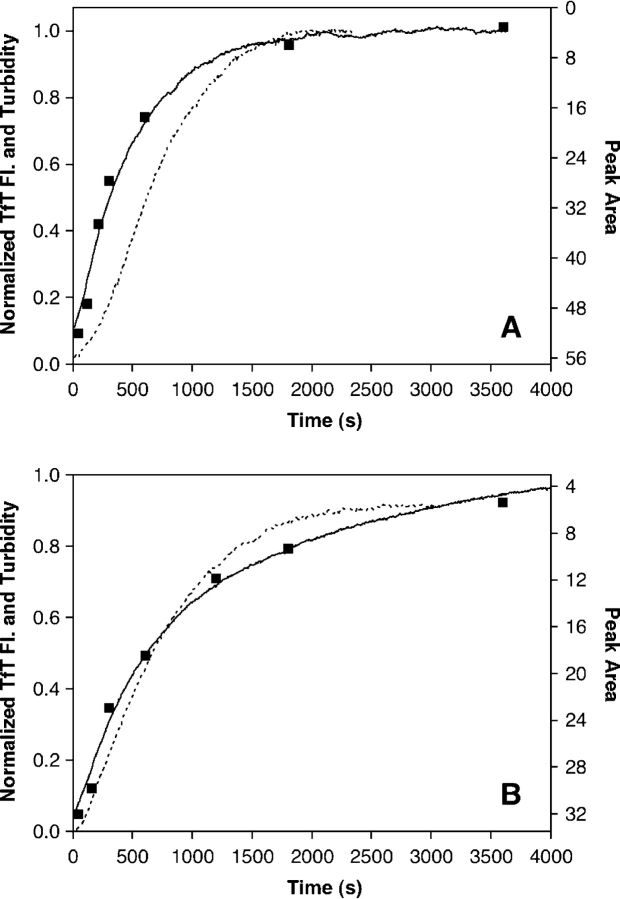 Twenty-five micromolar PrP aggregation followed by TfT binding, monomer disappearance, and turbidity. A displays plots of aggregation for PrP 23–231, and B displays aggregation data for PrP 90–231. Both turbidity and TfT-binding traces were normalized to a value of 1 and correspond to the Y-axis on the left, while the Y-axis on the right corresponds to the peak area calculated from gel filtration (not normalized). The peak area axis is inverted such that the monomer disappearance data overlays with data from the other methods used. The solid line displays aggregation monitored by TfT binding, the dotted line corresponds to turbidity, and the square dots represent the gel filtration monomer disappearance data.