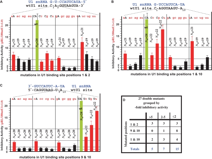 Analysis of U1-binding sites with double-point mutations at positions 1 and 2, 1 and 10 or 9 and 10. A saturation mutagenesis analysis was performed where all possible double mutations were introduced at positions 1 and 2 (A) 1 and 10 (B) and 9 and 10 (C) of the 10-nt wtU1-binding site of the pRL/180wtU1 plasmid shown in the Supplementary Data Figure S1. The mutations were analyzed and graphed as in Figure 3. The sequence of the wtU1-binding site and its base pairing with the 11 nt of the 5′-end of U1 snRNA (blue font) is schematized above the graph. Each pair of letters indicates a particular mutant where the lowercase red letters correspond to a mutation, while the uppercase black letters match the wtU1-binding site. Each pair of letters is positioned above its corresponding bar graph representing the inhibitory activity of that mutated U1 site. Also indicated are the NH values that are defined as the number of continuous hydrogen bonds (see Discussion section). To facilitate comparison we included the single-point mutations from Figure 2 as red histograms. All double mutants (totals) or double mutants from (A) (1 and 2), (B) (1 and 10) and (C) (1 and 10) were classified according to their good, low or no inhibitory activity (>5-, 2–5- and ≤2-fold inhibition, respectively). Shown is the number of double mutants in each group (D).