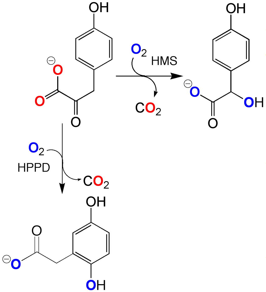 Hydroxymandelate Synthase (HMS) catalyzes an α-keto acid dependent dioxygenase reaction, forming 4-hydroxymandelate (HMA) from 4-hydroxyphenylpyuruvate (HPP) in what appears to be an analogous reaction to that catalyzed by 4-hydroxyphenylpyuruvate dioxygenase (HPPD). HPPD forms homogentisate (2,5-dihydroxyphenylacetic acid, HG) by hydroxylation of the aromatic ring, inducing a 1,2-migration, while HMS hydroxylates instead the benzylic carbon (Scheme 1). HPPD has been studied quite extensively as it is a target of di- and triketone molecules that act as herbicides and therapeutics [1]. In plants these molecules prevent the synthesis of HG, which is precursor to the essential plant cofactors, plastoquinone and tocopherol [2–4]. In mammals, the inhibtion of HPPD can be used to completely alleviate the debilitating and/or lethal symptoms of specific inborn defects in tyrosine catabolism [5–8].