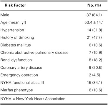 The average age of the patients was 53.4 ± 14.1 years (range, 21–71 yr). The underlying disease was degenerative aortic aneurysm in 42 patients (95.4%) and acute aortic dissection in 2 patients (4.5%). Six patients (13.6%) had the Marfan phenotype. Aortic insufficiency was moderate in 30 patients (68.2%) and severe in 14 patients (31.8%). Preoperative risk factors are shown in Table I; Table II shows the aortic and cardiac diseases of the patients.