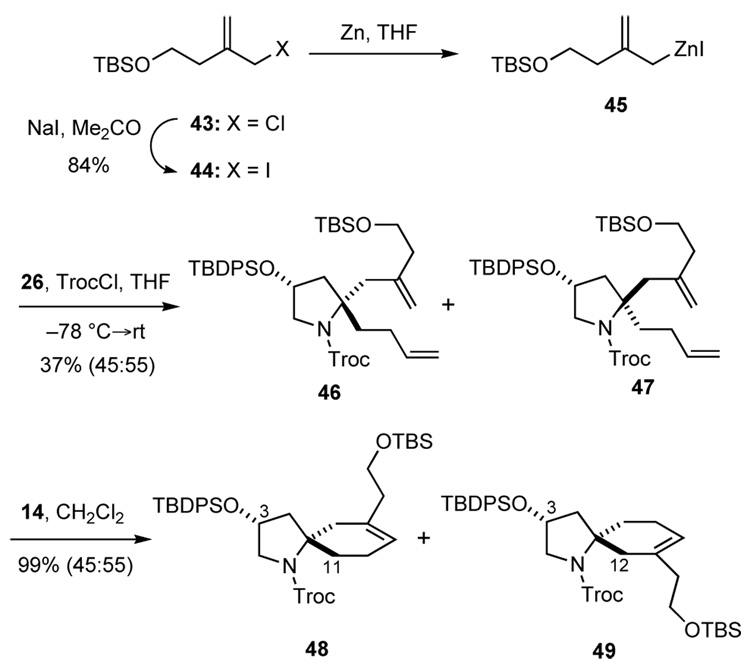 Owing to the low reactivity of the allyl silane 8, it was necessary to use a Lewis acid to promote the geminal dialkylation. It was thus apparent that such conditions were incompatible with the acid-sensitive nature of 26, and we thus reasoned that a more nucleophilic reaction partner that did not require Lewis acid additives was needed. Inasmuch as zinc reagents were known to add efficiently to imines,36 it occurred to us that a functionalized allylic zinc species might be employed to solve the problem at hand. In order to explore this possibility, the known allyl chloride 4337 was first converted into the iodide 44 in 84% yield by a Finkelstein reaction,38 and 44 was then allowed to react with zinc in THF39,40 to form 45 (Scheme 8). The chiral imine 26, which was generated in situ by the Pd-catalyzed deprotection of 41, was then treated with the functionalized zinc reagent 45 in the presence of TrocCl to give an inseparable mixture (45:55) of 46 and 47 in 37% yield. When CbzCl was used as the acylating agent, the yield was lower. The mixture of 46 and 47 thus obtained was then subjected to RCM using Grubbs 2nd generation catalyst 14 to give a separable mixture of 48 and 49 in nearly quantitative yield. Based upon NMR experiments and especially an nOe interaction between the proton at C(3) and a proton on C(12) of the major product, the structure of the major diastereoisomer was tentatively assigned as being 49, which has the incorrect stereochemistry at the spirocenter. Similarly, an nOe interaction was observed between the proton at C(3) and one of the protons on C(11) of the minor diastereoisomer as would be expected for 48, which has the desired stereochemistry at the spirocenter.
