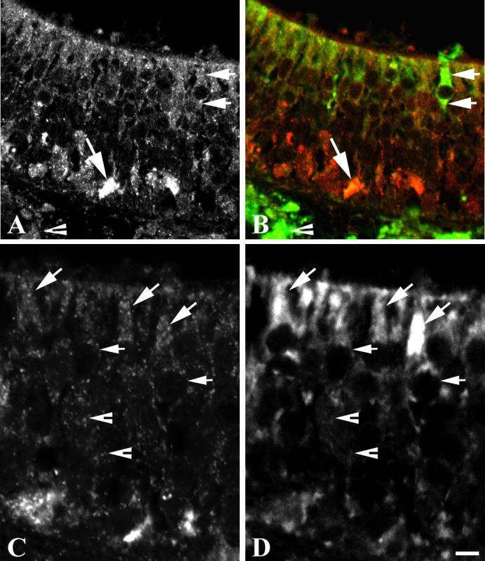Available data support an involvement of retinoic acid in the development of the olfactory system during embryogenesis (Anchan et al., 1997; Whitesides et al., 1998; Grun et al., 2000; Li et al., 2000; Suzuki et al., 2000; Niederreither et al., 2002b), and an involvement in the development of olfactory receptor neurons throughout adult life (Asson-Batres et al., 2003b). In previous studies, we have noted a concomitant increase in the number of proliferating basal cells and a decrease in the number of mature olfactory receptor neurons throughout the olfactory epithelium of frankly vitamin A-deficient postnatal rats (Asson-Batres et al., 2003b). These results support the notion that vitamin A and/or its derivative, retinoic acid, are playing an essential role in regulating cell proliferation and differentiation events in the postnatal olfactory epithelium. Specifically, we hypothesize that retinoic acid is regulating the development and maturation of olfactory receptor neurons throughout the postnatal olfactory epithelium. With this in mind, the present study was carried out to identify and localize RALDH protein expression in the postnatal olfactory organ and to characterize in greater detail the localization of the retinol/retinaldehyde binding protein, CRBP I, and the retinoic acid binding protein, CRABP II, in order to more precisely define potential cellular sites of synthesis and, as such, sources of retinoic acid in this sensory tissue. Our results indicate that RALDH 1 and RALDH 2 exhibit high levels of expression in different cell types throughout the postnatal rat olfactory organ and are found in close association with proteins that bind and transport retinol/retinaldehyde substrates and retinoic acid products utilized or produced by RALDH-catalyzed reactions.