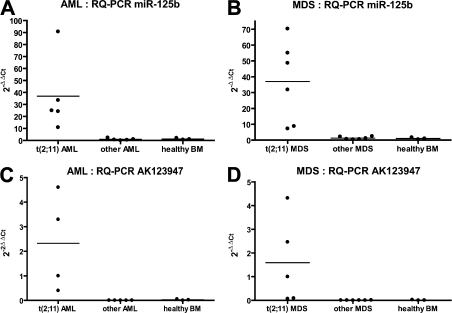 Overexpression of the mature miR-125b and one of its putative pri-microRNA (AK123947) in patients with the t(2;11)(p21;q23), as shown by RQ-PCR. (A) Up-regulation of the mature miR-125b in five AML patients with the translocation (P3, P7, P8, P9, and P10) compared with controls (five cases of AML without the t(2;11) and three BM samples from healthy individuals; P < 0.05). (B) The same results obtained in six MDS patients (P11, P12, P16, P17, P18, and P19). Controls are six MDS patients lacking the t(2;11) and three normal BM samples (P < 0.05). (C) The putative pri-microRNA AK123947 is also up-regulated in the AML patients (P3, P7, P8, and P9) compared with controls (P < 0.05). (D) The same results obtained in MDS patients (P11, P12, P16, P17, and P18; P < 0.05). Horizontal lines indicate mean values.