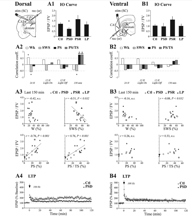 PSD selectively impaired LTP and excitatory synaptic transmission in the dorsal, but not the ventral, CA1. Left panel: Experiments performed in the dorsal hippocampus as shown by the schematic illustration of the recording site. (A1) PSD altered CA1 synaptic efficacy in the dorsal hippocampus. The summary bar graphs illustrate the mean I/O slopes (± SEM) for each condition. The I/O slopes in the dorsal hippocampus was significantly decreased in PSD (n = 7, 13 slices) compared to Ctl (n = 8, 15 slices, P < 0.02) and PSR (n = 7, 12 slices P < 0.01). (A2) Relationship between the vigilance state quantity and the I/O slope. The correlation coefficient r is represented for each vigilance state during the previous recording day, light-on and light-off periods, and the final 150 min before sacrifice. (*P < 0.05, ***P < 0.001). (A3) Regression analysis for the last 150 min period illustrated in A2. The scatter plots show a strong correlation between I/O slopes and PS quantity or PS efficacy in the dorsal hippocampus. SWS is negatively correlated with I/O slopes (n = 18; empty circle: Ctl, up arrow: PSR, down arrow: PSD, grey square: LP).(A4) Early phase of CA1 LTP is impaired by PSD in the dorsal hippocampus (illustrated in Figure 1). Right panel: Experiments performed in the ventral hippocampus as shown by the schematic illustration of the recording site.(B1) In contrast to the dorsal hippocampus, there was no significant difference between conditions in the ventral hippocampus.(B2-3) No correlation was obtained between the vigilance state quantity and the I/O slopes in the ventral hippocampus. (B4) Same amount of CA1 LTP in the ventral hippocampus of PSD (n = 4) and Ctl rats (n = 4).