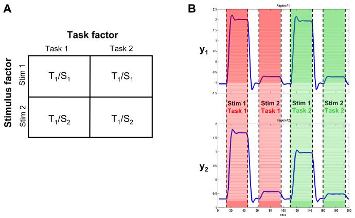 Fitted to regional fMRI time series, a given DCM explains how local brain responses were generated from the interplay of the three mechanisms described by the state equation (Eq. 5): inter-regional connections, their contextual modulation and driving inputs. Figure 4 provides a simple fictitious example that is based on simulated data. In this example we fix the parameters and use DCM as a model to generate synthetic data, as opposed to its usual use, i.e. estimating parameter values from empirical data. Let us imagine we are dealing with a 2×2 factorial experiment (Fig. 4A) where one experimental factor controls sensory stimulation (stimulus S1 vs. stimulus S2) and a second factor controls task requirements (task T1 vs. task T2). Let us further imagine that, using conventional statistical parametric mapping, we had found a main effect of sensory stimulation in a particular brain area x1 (with observed time series y1; see Fig. 4B, upper panel) and a stimulus-by-task interaction in area x2 (with observed time series y2). This interaction means that the difference between stimulus S1 and stimulus S2 is larger during task T1 than during task T2 (see Fig. 4B, lower panel). We can generate the (noise-free) data shown in Fig. 4B using the DCM displayed by Fig. 4C. The stimulus main effect in area x1 results from the driving inputs to x1 being much stronger for stimulus S1 than for stimulus S2. This differential effect is then conveyed onto area x2 by the connection from x1 to x2. Critically, the strength of this connection is strongly enhanced during task T1, but only marginally influenced during task T2. This difference in modulation causes the interaction in area x2 (note that this model would have produced an interaction in area x1 as well if we had chosen a stronger back-connection from x2 to x1).