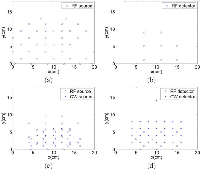 In both cases, a solid calibration phantom measurement (optical only) is required before or after the patient data acquisition. For most of the experiments, more than one RF and CW source scan is completed within a 45 s duration. Typically the RF sources are scanned twice at 20 locations, while the MUX CW sources are scanned 7 times at 28 locations. The repeated measurements were averaged and used for the image reconstructions in this paper. The major difference between the two protocols is the temporal duration between the initial breast compression and the optical data acquisition. In Protocol 2, the elapsed time between the initial compression and optical data acquisition is roughly 1 or 2 min longer than in Protocol 1. Based on our study of breast compression induced tissue changes [25], we expect more hemodynamic change during the measurement period in Protocol 1 than in Protocol 2. However, tissue dynamics are not the major concern of this paper, a preliminary study on spatio-temporal image reconstruction of tissue dynamics can be found in Boverman et al. [26].