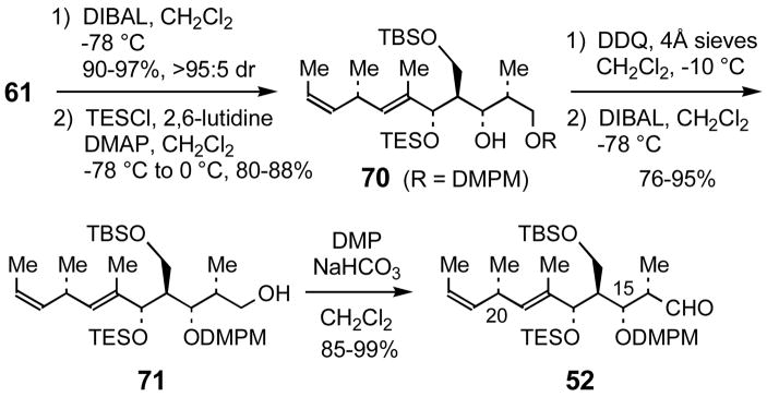 The synthesis of C(13)–C(23) aldehyde 52 from 61 was completed in five steps (Scheme 16). Reduction of the β-hydroxy ketone 61 to the syn-1,3-diol with DIBAL and selective silylation57 of the allylic alcohol provided TES ether 70. The dimethoxybenzyl ether of 70 was transferred to the secondary alcohol via benzylidene acetal formation followed by regioselective acetal reductive opening with DIBAL. Finally, oxidation of primary alcohol 71 using the Dess-Martin periodinane provided aldehyde 52 in excellent yield.