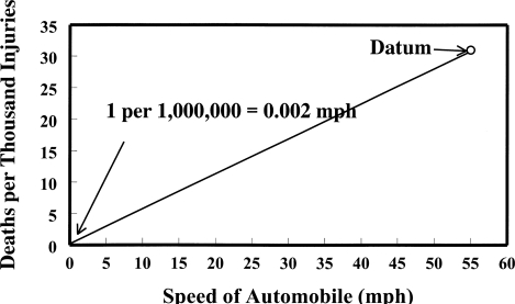 Figure 8 shows a hypothetical chemical that produces tumors in 3.1% of the animals when administered 55 mg/kg/day. The extrapolation is based on the assumption that the data extend linearly to the 0, 0 origins. With this same interpretation, in order to have only one tumor in a million individuals, the dose would be 0.002 mg/kg/day. Figure 9 illustrates how the same numbers could be used to extrapolate to one in a million deaths from actual data on highway deaths in the United States per thousand injuries at a speed of 55 mph (Baker et al., 1992). This same thinking would set the speed limit at 0.002 mph.