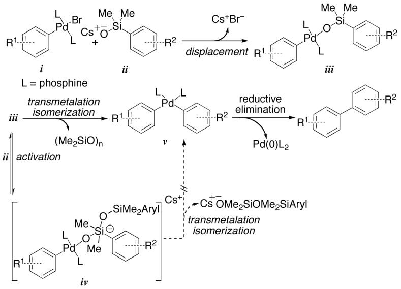 Early proposal for the mechanism for the fluoride-free cross-coupling of silanols.