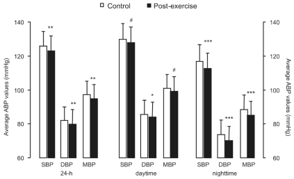 Average twenty-four hour (24 h), daytime, and nighttime ABP values after a single exercise session (post-exercise) or a nonexercise control period (control). SBP: systolic BP; DBP: diastolic BP; MBP: mean BP. Asterisks denote a significant difference from control period (*p=0.04; **p≤0.004; ***p≤0.0001). #Tended to be different from control period (p=0.06)