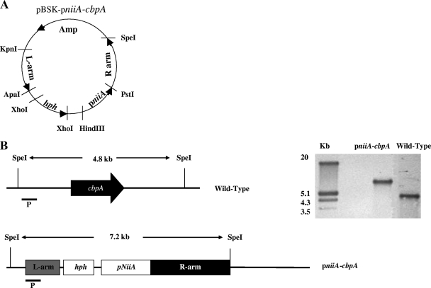 Generation of the pniiA-cbpA strain. (A) The promoter replacement construct comprises the hygromycin B resistance cassette, 1.2 kb upstream (L arm), 1.5 kb downstream from the predicted ATG start codon of the cbpA gene (R arm), and 1 kb of the nitrate-inducible promoter sequence (pniiA). (B) Southern analysis of SpeI-digested genomic DNA using the left flank probe (P) displayed an expected 4.8-kb fragment in the wild-type strain and a 7.2-kb fragment in the pniiA-cbpA mutant, confirming successful replacement of the cbpA endogenous promoter by the nitrate-inducible promoter pniiA.