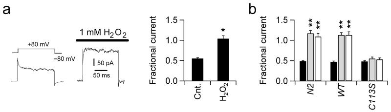 B Fractional currents at +80 mV in four days old N2, wild type-KVS-1 and C113S-KVS-1 neurons in the absence (black, n = 15, 14 and 11 cells, respectively) and presence of 0.25 mM H2O2 (light grey, n = 12, 11 and 9 cells respectively) or 0.25 mM CHT (white, n = 10, 11 and 5 cells respectively) in the patch pipette.