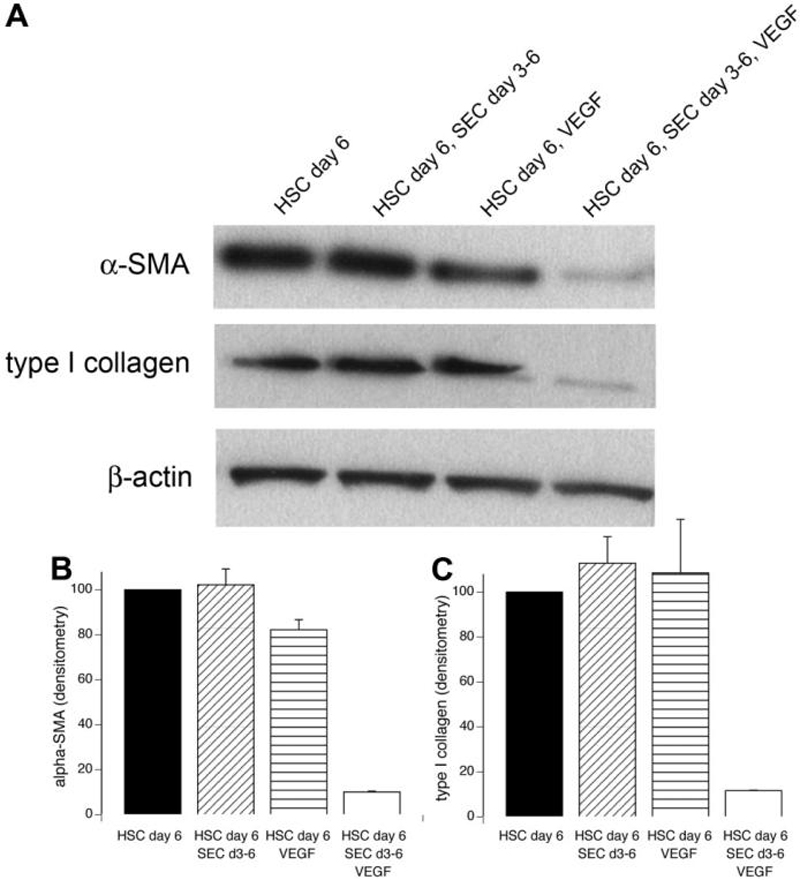 Reversal of HSC phenotype. In this experiment, HSCs are allowed to activate over 3 days (days 0-3) by culturing alone on plastic. From day 3 to day 6, HSCs are cultured either: alone, with SEC (which capillarize over the course of the next 3 days), with VEGF, or with VEGF plus SEC (that remain differentiated because of the presence of VEGF. (A) Immunoblot for ASMA and type I collagen. Lane 1 examines HSCs cultured alone for 6 days. Lanes 2-4 examine whether HSCs that are activated by day 3 can revert to quiescence by day 6. Lane 2, HSCs cultured alone from day 0 (the day of HSC isolation) to day 3 followed by co-culture from day 3 to day 6 with SECs isolated on day 3 (note: SECs will capillarize when cultured for 3 days with activated HSCs). Lane 3, HSCs cultured alone from day 0 to day 3, followed by the addition of VEGF from day 3 to day 6. Lane 4, HSCs cultured alone from day 0 to day 3, then from day 3 to day 6 with the addition of VEGF plus co-culture with SECs isolated on day 3 (note: SECs remain differentiated when cultured for 3 days with VEGF). (B) Densitometry of ASMA corrected for β-actin loading. P < 0.0001 by ANOVA, P < 0.001 by least significant difference for HSC co-cultured with SECs plus VEGF compared with HSCs alone (n = 3). (C) Densitometry of type I collagen, corrected for β-actin loading; P < 0.005 for ANOVA, P < 0.005 by least significant difference for HSCs co-cultured with SECs plus VEGF compared with HSCs alone (n = 3).