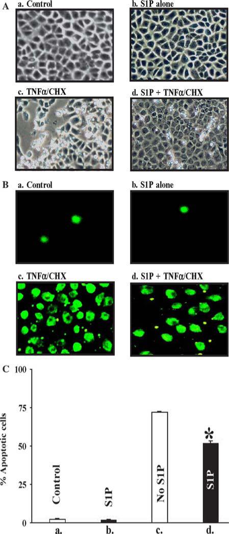 S1P has a protective effect from apoptotic stimuli in intestinal epithelial cells. (A) Cells were photographed before (a and b) and at 4 h after (c and d) exposure to TNF-α/CHX (doses of 20 ng/ml and 25 mcg/ml, respectively). Panels a and c are of control cells, and the right panels (b and d) are of cells that underwent a 1 h pretreatment of S1P (2.5 mcM). At 4 h after exposure to TNF-α/CHX the S1P-pretreated cells (d) were less susceptible to apoptosis compared with the control (c); the picture is representative of findings from three separate experiments. (B) The next four panels are the exact same conditions with Annexin V staining of the cells, demonstrating less apoptotic activity in the S1P-exposed cells. (C) Graphical depiction of the effect of S1P (2.5 mcM) on apoptosis by exposure to TNF-α/CHX as presented in (A); values are mean ± SE of data from three experiments. * P < 0.05 compared with control and S1P cells treated with TNF-α/CHX, respectively