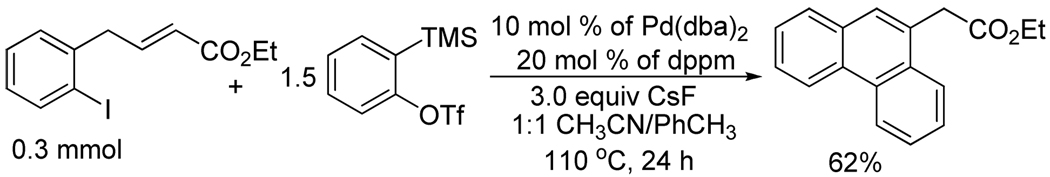 (E)-3-(2-Iodophenyl)acrylonitrile (1a) was used as a model system for optimization of the reaction conditions using 2-(trimethylsilyl)phenyl trifluoromethanesulfonate (2a) as the aryne precursor. We optimized the reaction conditions with respect to different ratios of the acetonitrile/toluene solvent system; the phosphine ligands P(o-tolyl)3, tris(2,4,6-trimethoxyphenyl)phosphine, tris(2,6-dimethoxyphenyl)phosphine, tri(2- methoxyphenyl)phosphine, tri-(2-furyl)phosphine, [(CH3)3P·AgI]4, tri(t-butyl)phosphine, 2-(di-tert- butylphosphino)biphenyl, xantphos, dppp, dppf, and dppm; the temperatures (85 °C, 100 °C, 110 °C and, 120 °C) at which the reaction is run; the amount of the aryne precursor; the amount of CsF; and various Pd(dba)2 catalyst loadings (5-20 mol %) with different ratios of Pd(dba)2 catalyst to dppm ligand. Our “optimal” procedure involves heating 0.3 mmol of 1a, 1.5 equiv of 2a, 10 mol % of Pd(dba)2, 20 mol % of dppm, and 3.0 equiv of CsF in 5 ml of 1:1 acetonitrile/toluene at 110 °C in a sealed vial for 24 h.