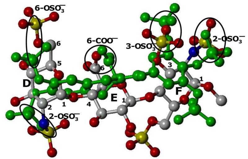 Historically, D, E, F, G, and H refer to residue labels from the non-reducing end of the pentasaccharide. Sulfate groups in DEFGH highlighted as filled ovals (