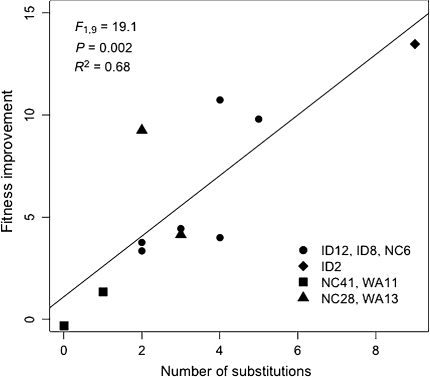 Fitness improvement and the number of mutations fixed during adaptation. A significant positive correlation was found between the number of substitutions and the magnitude of fitness improvement for an adaptive walk (R2 = 0.68, F1,9 = 19.1, P = 0.002). The regression line is shown. Phylogenetic groups (see Fig. 1) are designated with different symbols