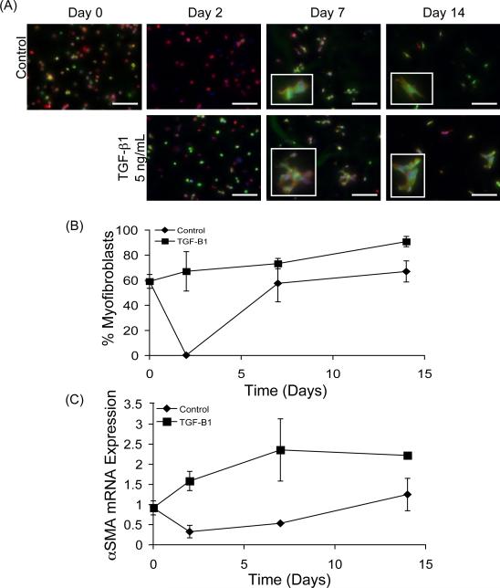 Positive immunostaining for αSMA stress fibers can be seen visually at the later time points (day 14) (Fig. 7A). Increased staining was also quantified with image analysis and revealed elevated αSMA positive staining in the TGF-β1 treated samples compared to untreated controls (Fig. 7B). A significant difference in αSMA gene expression was also observed with qRT-PCR analysis with roughly a doubling in αSMA mRNA levels with TGF-β1 treatment (Fig. 7C). By comparison, TGF-β1 has also been found to induce a doubling of αSMA in 2D VIC cultures after 48 hours [11].