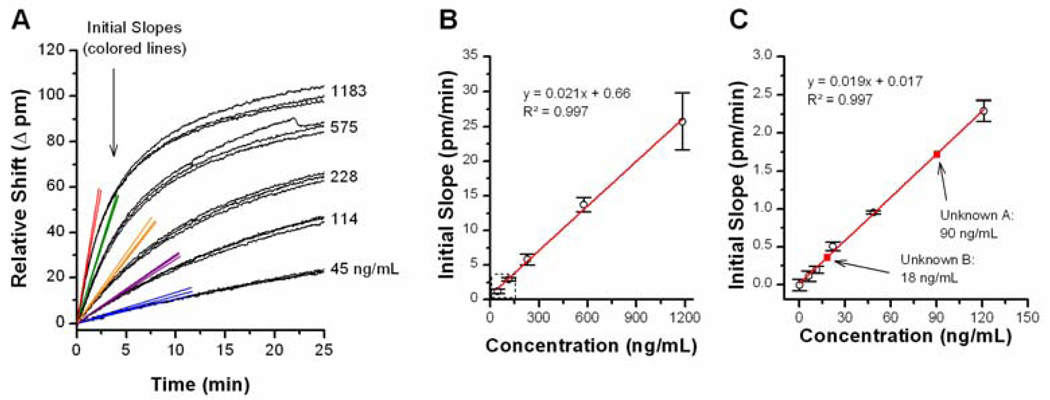 In order to accomplish this analysis, the initial portion of the association curve is fit to an exponential functional form and then differentiated at t = 0 to give the initial slope (a more detailed description of the data fitting and initial slope determination can be found in the Supporting Information). The colored lines in Figure 6A represent fitted tangent lines that give the initial slope for each association curve at each concentration. The initial slope values determined from the data in Figure 6A are plotted as a function of concentration in Figure 6B (error bars 95% confidence interval (C.I.), number of measurements (n) = 3). Notably, the resulting slope-based calibration plot is linear (coefficient of determination (R2) for the linear fit is 0.997), which enables simple sensor calibration and extended linear dynamic range, particularly at higher antigen concentrations. While data from only a single microring is shown for clarity, the response of multiple sensors were simultaneously recorded and found to also yield linear calibration plots with extended dynamic ranges. While each microring behaved in a similar fashion, it is apparent that small differences in antibody loading require each microring sensor to be independently calibrated. Methods of a priori sensor normalization are currently being investigated; however, the process of independent calibration has the potential to be fully automated in future applications.
