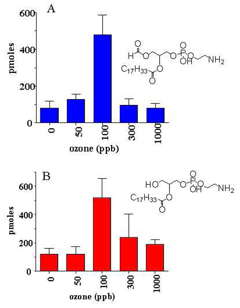 Phospholipid products generated by ozone exposure (0 ppb, 50 ppb, 100 ppb, 300 ppb and 1000 ppb) of 18:0p/18:1-PE. Products were measured using LC/MRM analysis. A) 1-formyl-2-octadecenoyl-PE (blue, m/z 506→281) and B) 1-hydroxy-2-octadecenoyl-PE (red, m/z 478→281) Quantitation was based on standard curves. Results are expressed as mean ±SEM (n = ≥3).