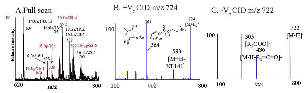 Identification of PE phospholipid molecular species by mass spectrometry. Isolated surfactant from two mice was pooled and separated on an aminopropyl solid phase extraction column (see methods for conditions). The collected eluant was additionally separated using NP-LC/MS, fractions were collected, and all PE phospholipids were pooled for individual lipid species identification. A) Pooled PE phospholipids were infused. Shown is a negative ion full mass spectrum from m/z 620–800. Plasmalogen species are indicated in red text. B) Positive ion CID of m/z 724 (16:0p/20:4-PE) yielded abundant fragment ions at m/z 361 and m/z 364, corresponding to the sn-1 and sn-2 fragments indicative of plasmalogens. A fragment corresponding to the NL 141 at m/z 583 was also observed. C) Negative ion collision induced dissociation of m/z 722 (16:0p/20:4-PE) confirmed sn-2 arachidonate carboxylate anion (m/z 303) as the most prominent fragment, as well as a neutral loss as a ketene (m/z 436).