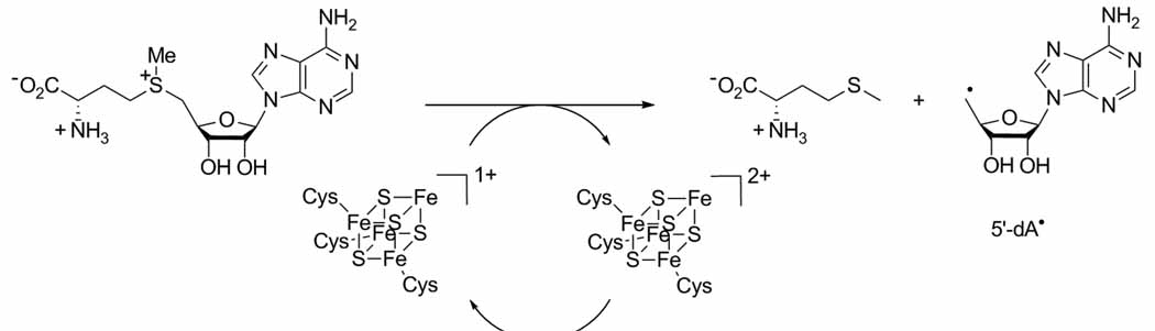 RlmN and Cfr represent an intriguing pair of evolutionarily related rRNA modifying enzymes with completely different functions: one (RlmN) is an endogenous enzyme used by the cell to refine functions of the ribosome in protein synthesis, and the other (Cfr) is an acquired methyltransferase that protects cells from the action of antibiotics. Besides the important biological functions of the two enzymes, the enzymatic mechanisms which are thought to be used by these methyltransferases squarely place RlmN and Cfr among the most interesting types of RNA-modifying enzymes. Most of the enzymes which methylate cellular RNA targets use S-adenosylmethionine (SAM) as a donor of electrophilic methyl groups to methylate nucleophilic oxygen atoms within the ribose moieties or nitrogen atoms within RNA nucleotide bases. RlmN and Cfr are unique as they perform enzymatically unprecedented methyl transfer to sp2-hybridized carbon atoms of an adenosine nucleotide. RlmN and Cfr belong to the Radical SAM superfamily, which is characterized by the presence of the cysteine-rich CX3CX2C motif.15–18 Enzymes belonging to the Radical SAM superfamily use this motif to ligate a unique four iron - four sulfur cluster (4Fe-4S), which, upon reduction to the +1 oxidation state, donates one electron to the bound SAM, leading to the formation of a 5′-deoxyadenosyl radical (5′-dA·) and methionine (Scheme 1). The resulting 5′-deoxyadenosyl radical is a potent oxidant which then initiates a radical transformation by performing hydrogen atom abstraction from its substrate. Subsequent catalytic steps, specific to the given Radical SAM enzyme, result in a variety of outcomes such as amine shifts (lysine aminomutases),19–23 nucleotide reduction (ribonucleoside triphosphate reductase III),24–26 sulfur insertion (biotin synthase, lipoyl synthase),27–32 oxidative decarboxylation (coproporphyrinogen oxidase),33–35 methylthiolation,36–39 and complex rearrangements,40 among others. Overall, members of this superfamily participate in more than 40 distinct biochemical transformations,16 and the full catalogue of functions carried out by these enzymes is yet to be determined.