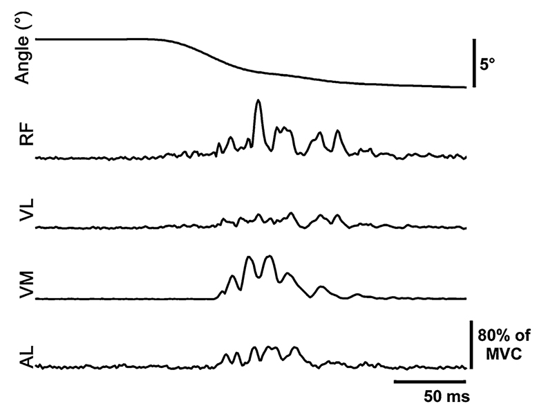 It is possible that the knee flexion perturbations could cause unintended length changes in AL due to vibrations transmitted through the measurement apparatus to the tissues connecting the knee to the hip (Burke et al. 1983). To address this issue, a series of patellar tendon taps was applied to each subject, providing a direct isolated stretch of the quadriceps muscles. During these control experiments, subjects were instructed to stay relaxed while a series of 20 taps were applied using an instrumented tendon tap hammer (Dhaher et al. 2003) and the corresponding EMG responses were recorded. Tap force was manually adjusted for each subject to produce consistent reflex responses in the quadriceps.