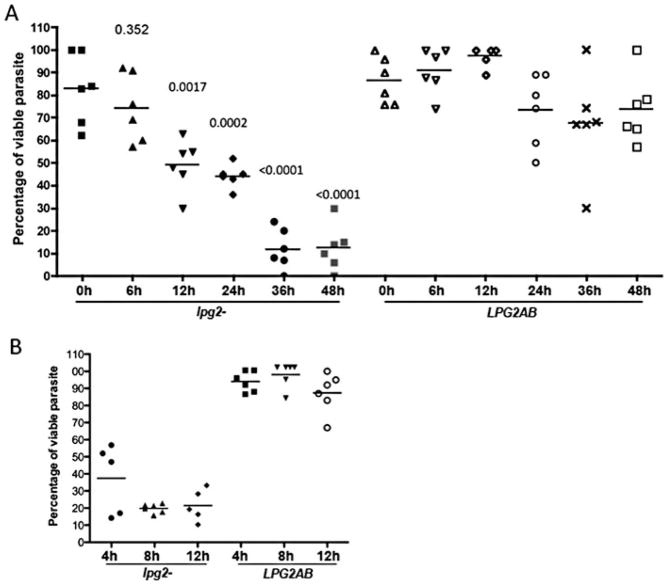 B. Percentage of viable promastigotes following exposure of lpg2− mutants to individual 36 h blood-fed, P. duboscqi midguts for 4, 8 and 12 h at 26°C. Bars represent the mean number of viable parasites present after incubation with midgut lysates calculated as the percentage of the mean number of viable promastigotes present in six 1 μl aliquots of the organisms incubated alone. P-values shown were calculated in comparison to lpg2− incubated with midgut lysate from non-blood fed flies (0 h).