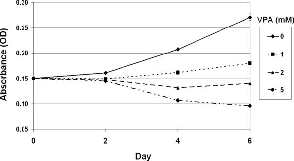 VPA inhibits MTC cell proliferation in vitro. MTC cells were treated with VPA (0–5 mM) for up to 6 days and cell viability was measured every 2 days with the MTT assay.