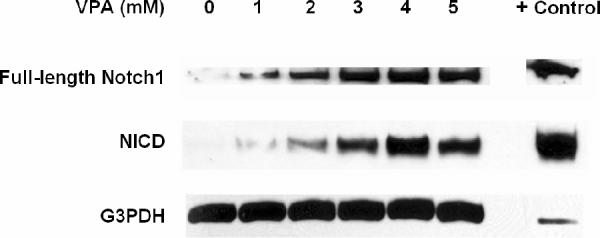 We have previously reported that Notch1 signaling is absent at baseline in human MTC tumors, and that Notch1 overexpression with an inducible Notch1 construct inhibited MTC cell growth and hormone production5. Recent research has demonstrated the ability of VPA to increase Notch1 protein levels in neuroblastoma7 and carcinoid cancer8 cells. Based on these findings, we performed Western blot analysis on extracts of VPA-treated MTC cells to determine if Notch1 signaling is activated by VPA. There was no detectable Notch1 protein in untreated cells. Importantly, VPA treatment resulted in induction of both full-length Notch1 and the active, cleaved form of the protein (Figure 1). TSA, another HDAC inhibitor, also up-regulated expression of full-length and cleaved Notch1 (data not shown).