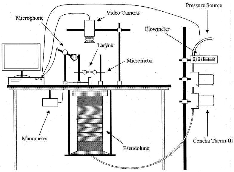 All measurements were carried out in a triple-walled sound-isolated room, designed to eliminated background noise and stabilize room temperature and humidity levels. The experimental bench apparatus shown in Figure 1 was built to create and monitor laryngeal phonation. A pressurized air source and pseudolung with pressure damping characteristics were used to generate air pressure at constant and measurable levels. Subglottal airflow was conditioned to 95% to 98% humidity at 36° to 38° C using two Concha Therm III humidifiers in series.