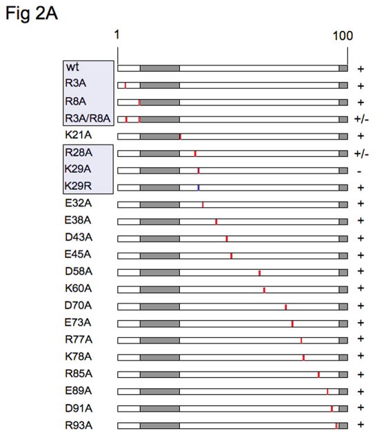 Basic residues, usually Arg or Lys, commonly bracket the hydrophobic core domains of signal peptides, membrane-spanning domains, and signal-anchor sequences. These charged residues are thought to influence the orientation of the sequence in the membrane and probably stabilize the interaction by forming salt bridges with the acidic head groups of phospholipids at the membrane-water interphase (34). To investigate the importance of charged residues near the hydrophobic sequence of Nvj1, we changed most of the charged residues throughout the lumenal domain (aa 1-96) one at a time to Ala (Fig. 2A). Only two of 21 changes (R28A & K29A) affected localization in vac8-Δ cells (Fig. 2A, B). The loss of K29 had a significantly greater effect on localization than the loss of K28 (Fig 2A, B). A reporter replacing K29 with Arg (K29R) showed normal localization (Fig. 2B), indicating that a basic charge at this position is important, and not a lysine residue per se.