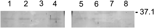 Immunoblots on total protein extracts from young leaves taken from S. pinnata (lanes 1–4) and S. albescens (lanes 5–8) treated with 20 μm selenate. Blots were decorated with polyclonal antibody raised against the A. bisulcatus SMT 36.7-kD protein (Neuhierl et al., 1999).