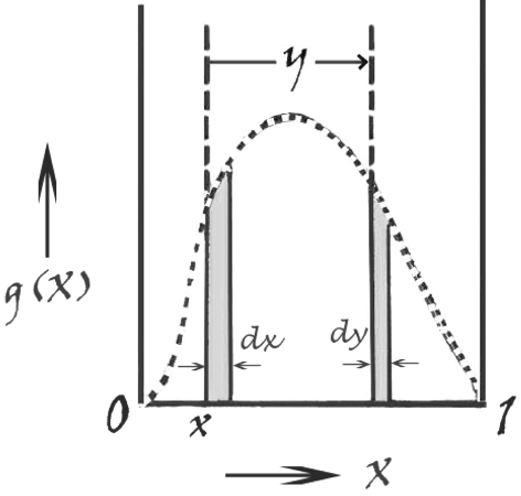 Consider the part of the distribution between the values x and x + dx with area g(x)dx and a second part of the distribution, at a distance y from x, so between x + y and x + y + dy with area g(x + y)dy. For a given value of x (0 ≤ x ≤ 1), −x ≤ y ≤ 1 − x. It should be noted that g(x + y) is the value of the p.d.f. g(Þ) of the random variable X at X = x + y.