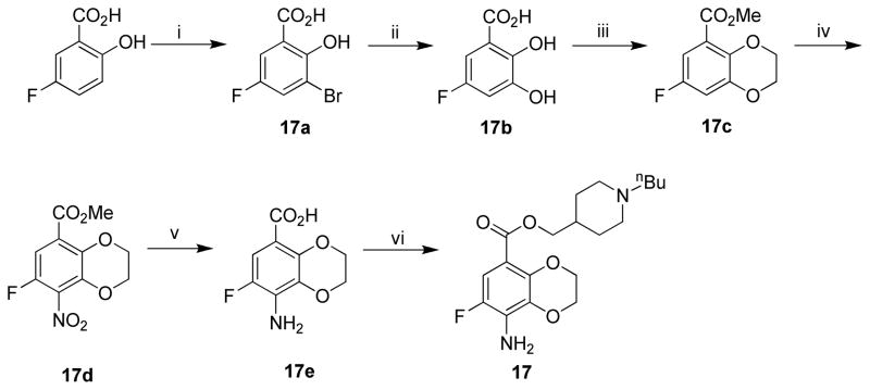 For the purpose of creating a radioligand that might be labeled with fluorine-18, we succeeded in preparing 17, a 7-fluoro analog of 1, in six steps from 5-fluoro-2-hydroxybenzoic acid (Scheme 4). All steps proceeded in > 75% yield, except the final two-stage esterification, involving Cbz–protection (34%) and trans-esterification (59%). Also, two fluoroalkoxy analogs of 13, the fluoro-methoxy compound 18 and the 2-fluoroethoxy compound 19, were prepared in two steps from methyl 4-amino-3-hydroxybenzoate in moderate overall yields of 37 and 20%, respectively (Scheme 5).