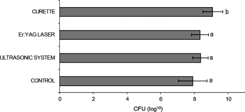 With regard to the levels of S. sanguinis adhesion to the different surfaces, the specimens treated with curettes showed the highest bacterial adhesion, followed by the ultrasonic system, Er:YAG laser, and control, which did not differ from each other (p < 0.05; Fig. 3). In addition, there was a moderate, but significant, positive correlation between roughness values and the S. sanguinis cell counts (p = 0.001; r = 0.65, r2 = 0.42).