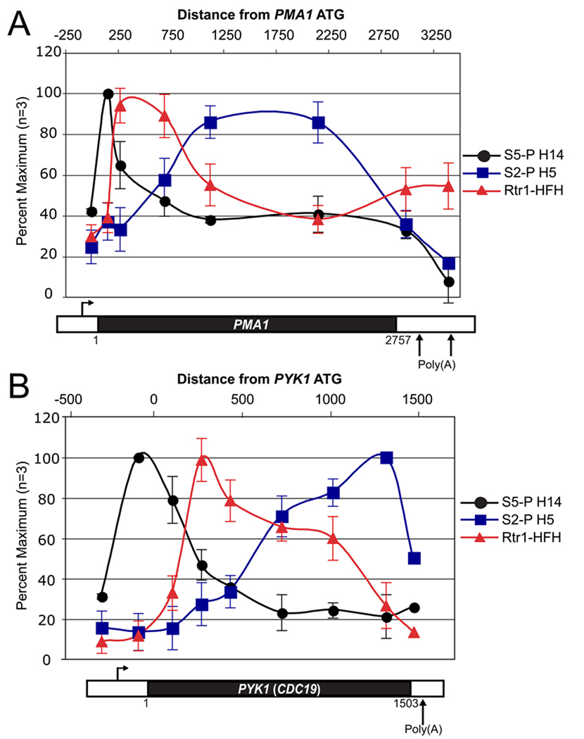 Rtr1 localizes to open reading frames. A. ChIP assays were performed using antibodies directed against different forms of RNAPII and Rtr1 as indicated. Quantitation of the S5-P (black circles) and S2-P (blue squares) occupancy compared to the occupancy of Rtr1 (red triangles) across the PMA1 genomic loci. B. Quantitation of protein occupancy across the PYK1 genomic loci as performed above. These data are shown as the average percent maximum IP ± standard deviation for comparison purposes between the different antibodies (n=3). The midpoint of the PCR amplicon was used as the distance from the ATG. A schematic representation of the genomic loci for each gene is shown below the graphs to illustrate the approximate location of the promoter and polyadenylation regions.