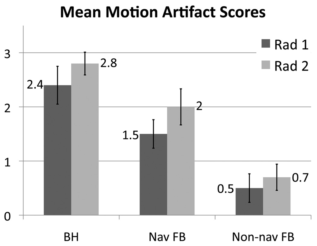 Further, as parallel imaging was not employed in the navigated acquisition, SNR is enhanced relative to non-navigated acquisitions and may bias image preference to the navigated acquisition. Thus, the incorporation of parallel imaging to accelerate image acquisition is critical and will be the focus of future work. This work also has the limitation that breath-held, navigated, and free-breathing non-navigated images were obtained at different times after administration of gadolinium. While this did not affect the ability to compare the degree of motion artifacts between different acquisitions, it did preclude blinding radiologists who were scoring the images as to the type of the exam.