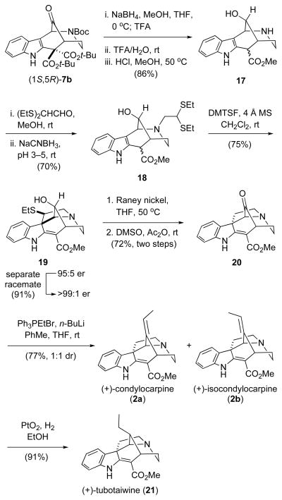 In three additional steps, pentacyclic intermediate 19 was converted to (+)-condylocarpine (2a) and (+)-isocondylocarpine (2b). The thioether group of 19 was cleaved with Raney nickel in THF at 50 °C to deliver the desulfurized product in 75% yield.19 After extensively screening conditions for oxidation of the secondary alcohol of this product, Albright–Goldman oxidation20 was identified as optimal for accomplishing this transformation, giving 20 in 72% yield for the 2 steps.21 Reaction of pentacyclic ketone 20 with ethyltriphenylphosphonium ylide in a mixture of THF and toluene at room temperature delivered a 1:1 mixture of enantiopure (+)-condylocarpine (2a) and (+)-isocondylocarpine (2b) in 77% combined yield. Pure samples of these interconvertible stereoisomers22 were obtained by preparative HPLC: (+)-condylocarpine (2a), [α]D +854 (c 0.39, CHCl3), and (+)-isocondylocarpine (2b), [α]D +798 (c 0.15, CHCl3). Catalytic hydrogenation23 of the initially produced mixture of 2a and 2b delivered (+)-tubotaiwine (21), [α]D +584 (c 0.91, CHCl3), in 91% yield.24–26